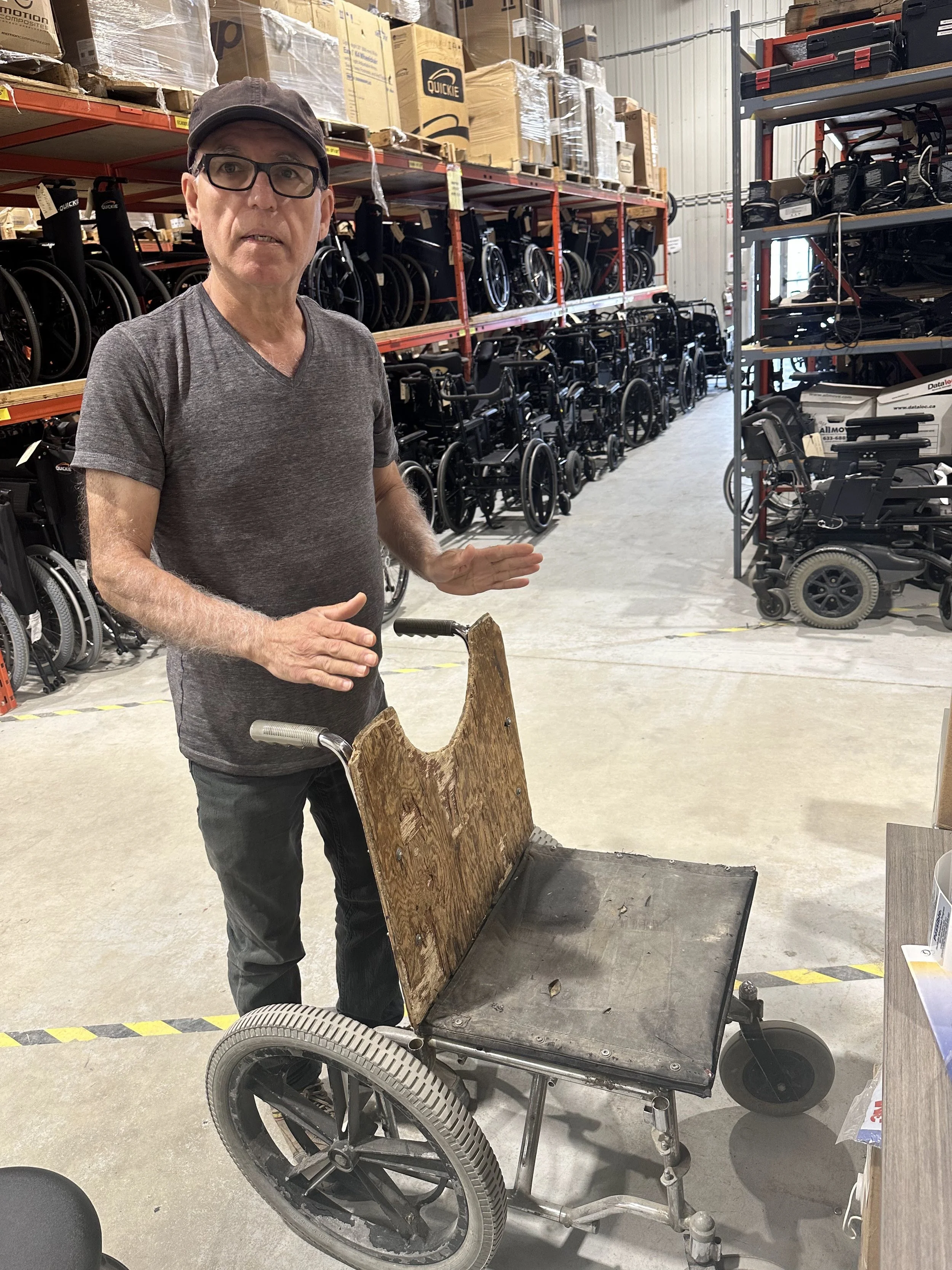 Electronic Technician, Mo shows an old model of a power wheelchair at Manitoba Possible’s Wheelchair Services.