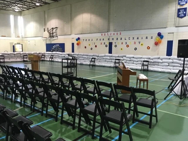 “It takes approximately 1500 tabs to make up one pound which converts to only 60 cents,” says Gwen. “There are approx. 50,000 tabs in a 30-40 lbs. bag and around 300 – 350 bags (14 – 18 million tabs) get filled each year.” An annual presentation is held each June at Holy Cross School’s Gymnasium where the recipient(s) is given their brand-new specialized wheelchair. Additionally, the recipient(s) for next year is introduced so that everyone leaves feeling motivated to keep the momentum going!
