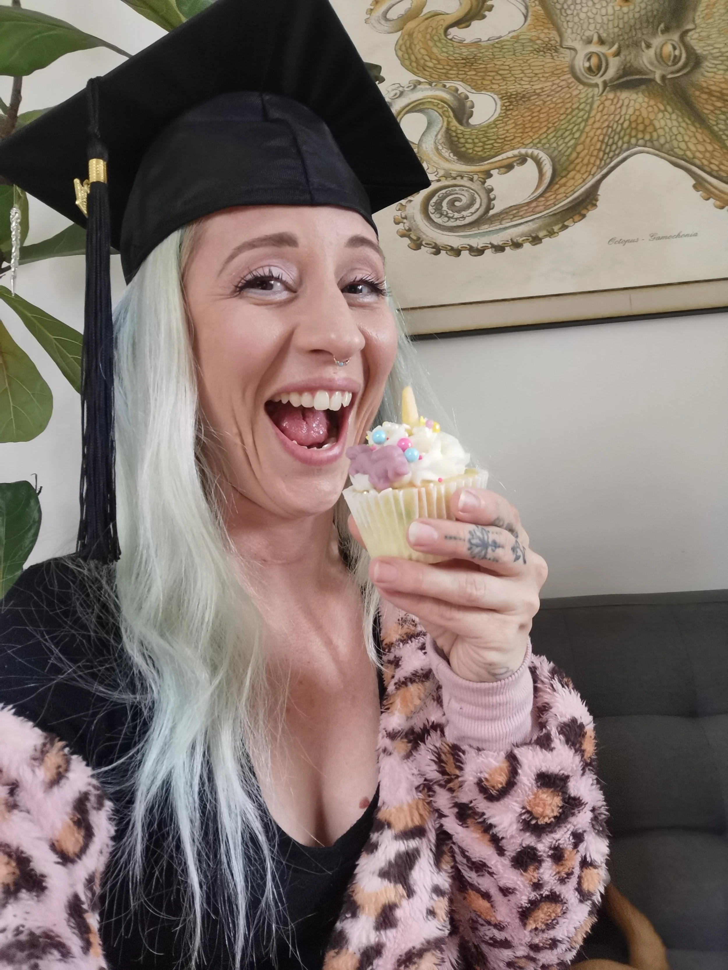 Amanda takes a selfie with a cupcake wearing her graduation cap and a big grin.