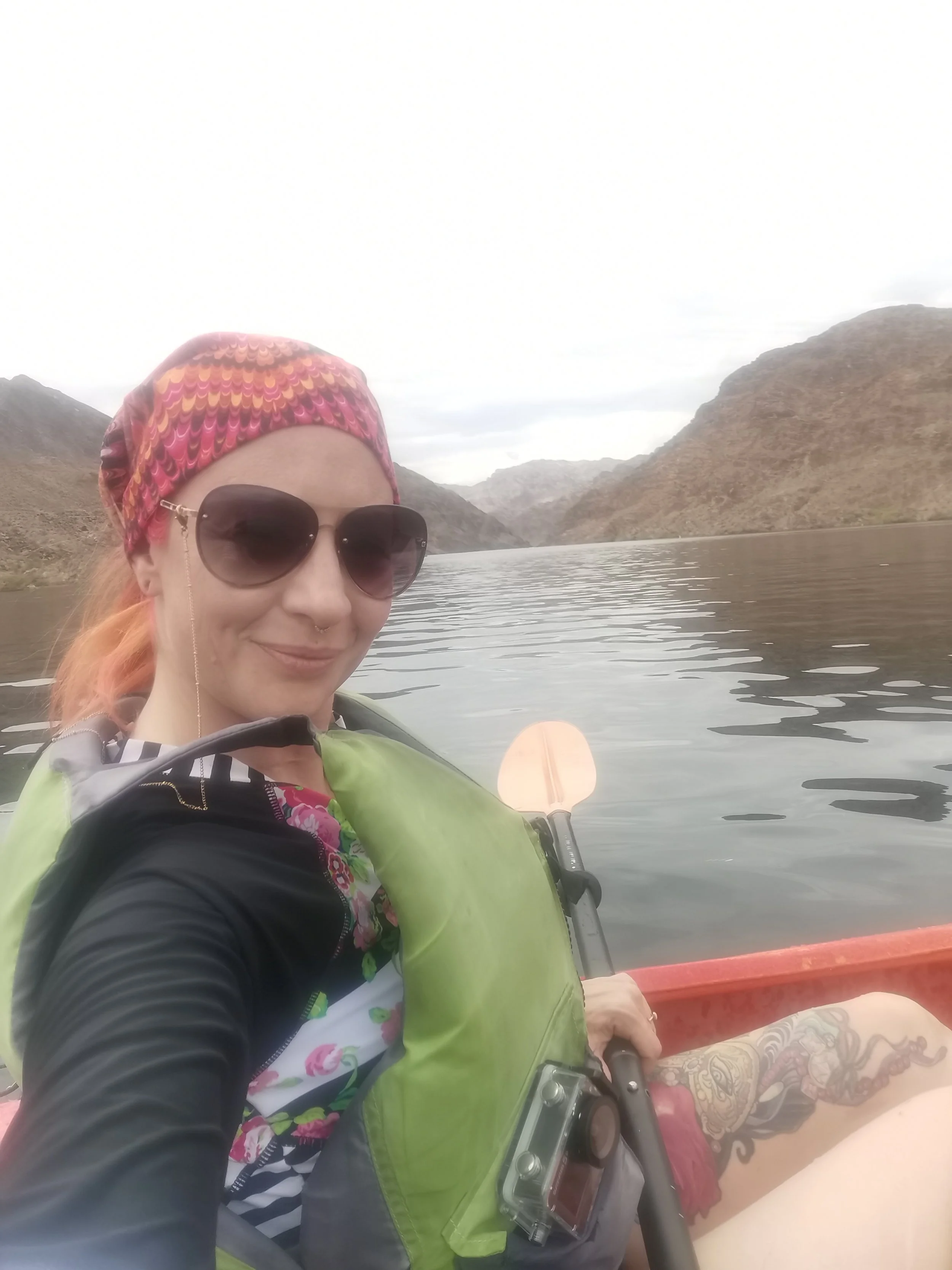 A selfie of Amanda, in sunglasses with a bandana around her hair, wearing a green life jacket and sitting in a red kayak on the Colorado River.