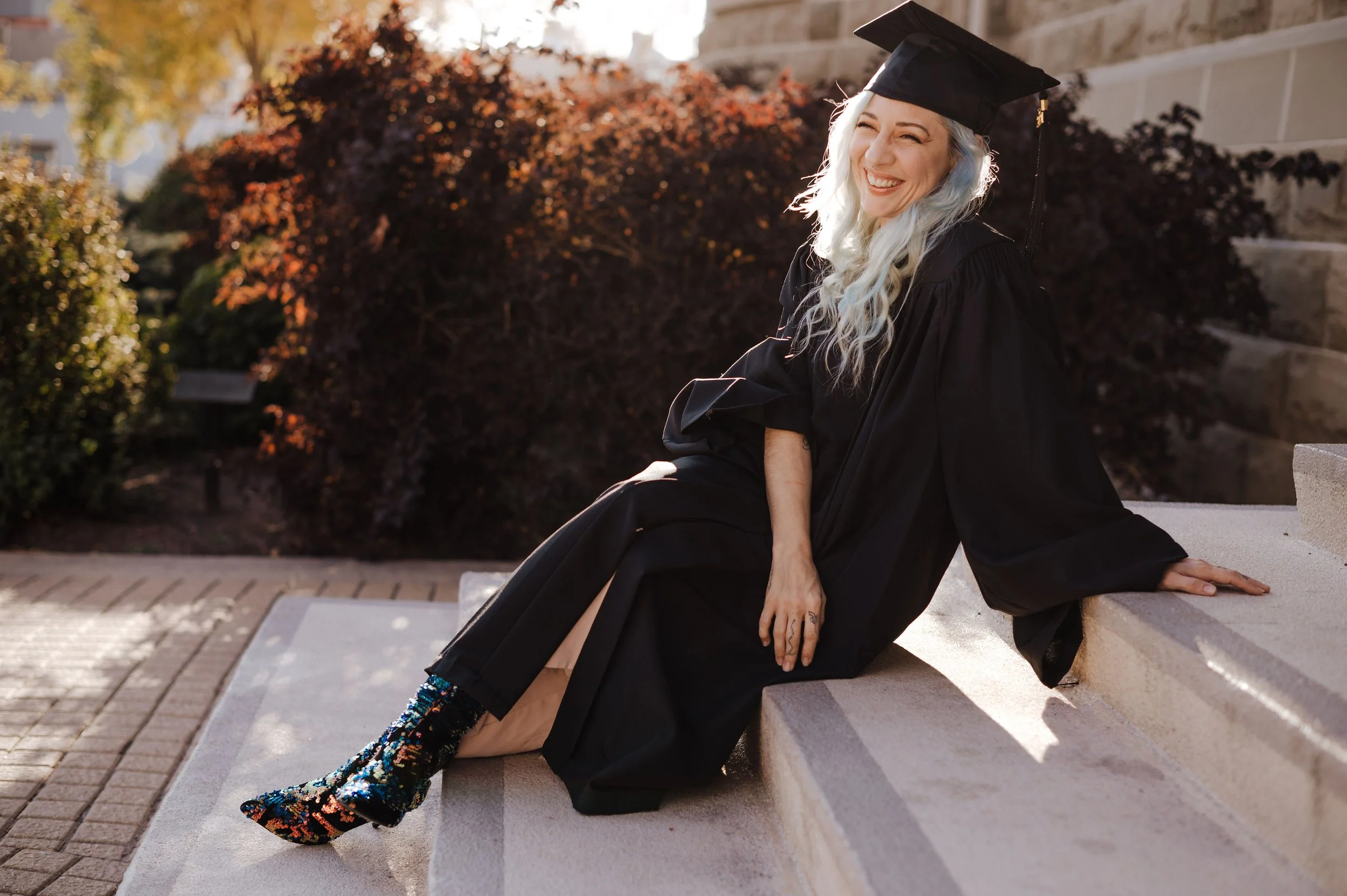 Amanda leans back on some steps with a big smile, wearing a black graduation cap and robes.